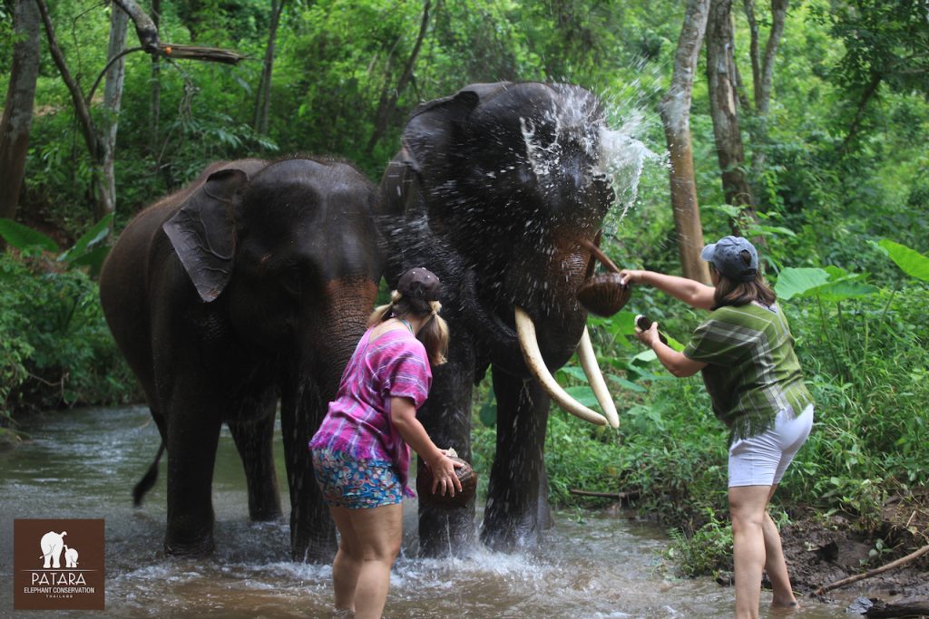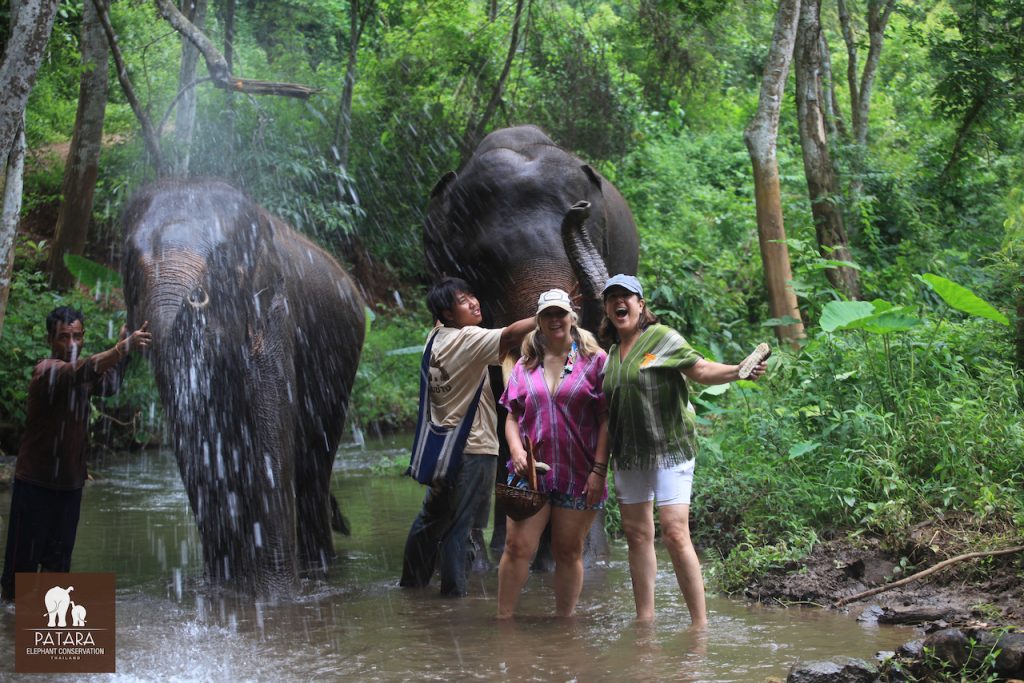 The mahouts signaled to the elephants to lie down in the creek so we could reach all the places (which Jenka gladly did—and The Queen held court to the side). What a special experience to have an ellie lie down so you can bathe them…. When Jenka stood back up, I half expected him to shake the water off…..but instead, Jenka and The Queen strolled over to the dirt pile and flung fresh dirt over their backs as a thai fly repellent.