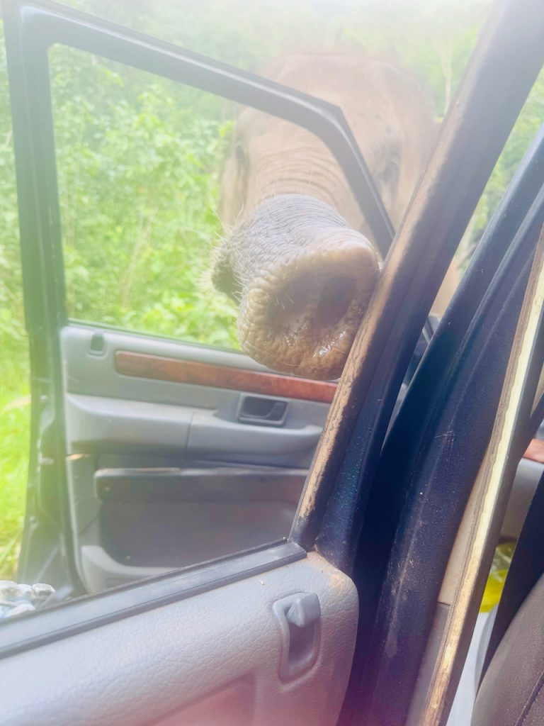Our Jeep came to a stop as we spied a pair of elephants (one with BIG tusks). The ellies came up to the SUV and put their trunks inside the windows looking for fruit treats…. It was a LOT to take in….and initially, I thought we were in a photo op situation. The crew handed me a heavy basket of fruit, and immediately, I was swarmed with two trunks asking….perhaps demanding a continuous supply of fruit. I couldn’t keep up—feeling a bit like I was on that I Love Lucy episode where she and Ethel couldn’t keep up with the chocolates coming down the conveyor belt…. I started laughing, which further slowed me down and the tusks (and giant feet) were precariously close…. Breathe, Becky, Breathe…