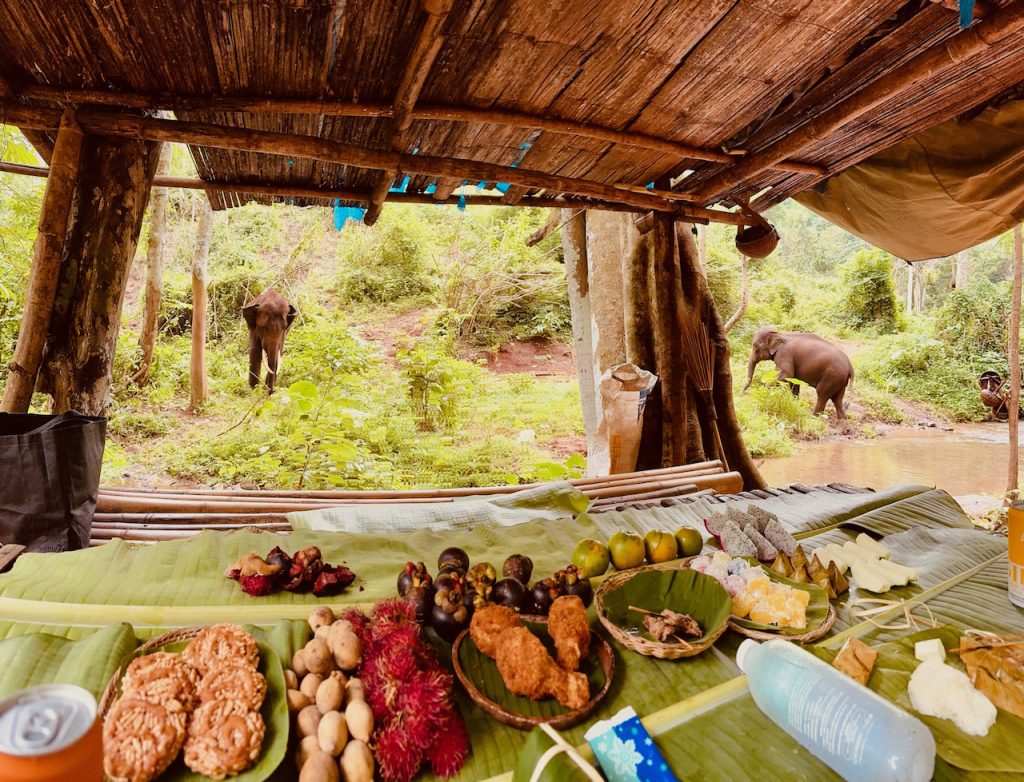 Sonia and I had a lovely luncheon next to the creek: local fruit, handmade pastries, satay, and other snacks while we dried off. Our pachydermic friends sauntered over and enjoyed our leftover vegetarian delights—a reward for taking care of two gringo American women on an adventure to see elephants and be an elephant caretaker for the day. And what a day it was. Would I recommend the experience?? 10/10 heck yes!!!